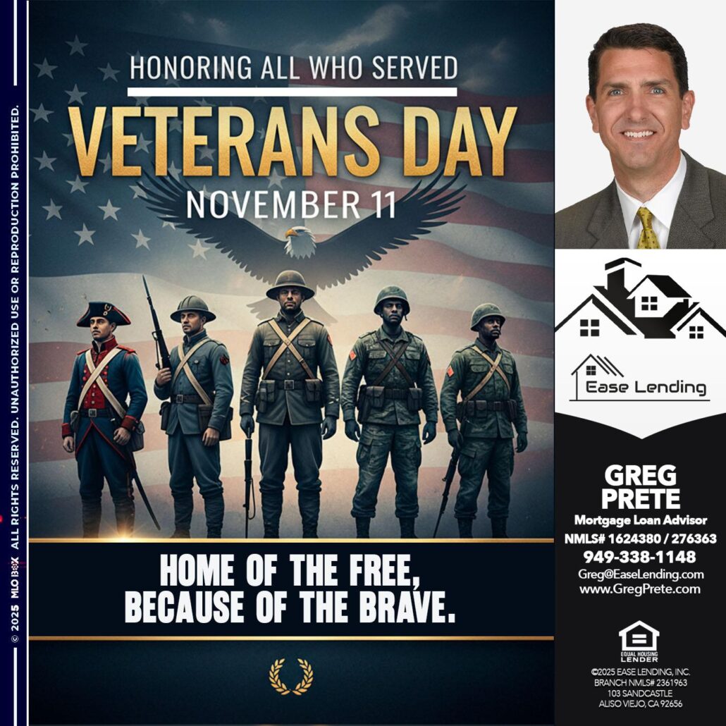 VETERANS DAY - Greg Prete -Licensed Loan AdvisorHi, my name is Greg Prete. I’m a Loan Officer with Ease Lending Team | Powered By Ease Lending Inc., offering personalized mortgage solutions, fast customized quotes, great rates and service with integrity.